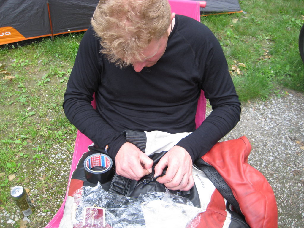 Auch das gehört dazu. Reparaturen während der Reise ist der Reisverschluss der Lederkombi defekt. Das heißt dann Bastelstunde... .