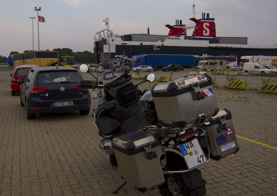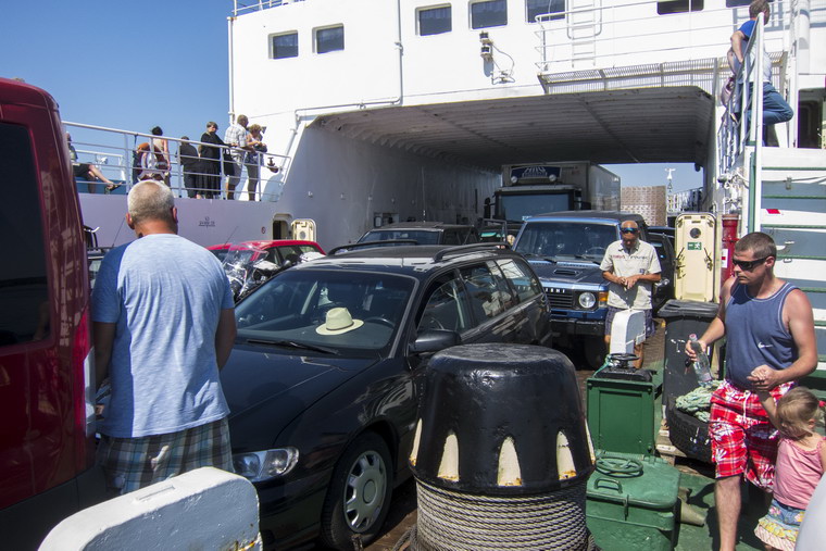 Mit mir verlassen viele LKWs die Fähre. Ein wenig ungeordnet wollen alle möglichst als erstes Fahrzeug die Fähre verlasssen, ein wenig Umsicht kann hier nicht schaden.