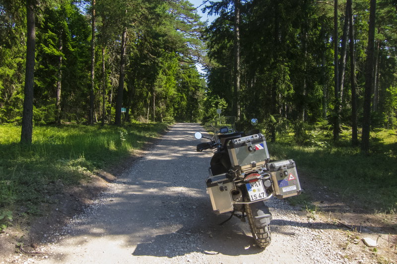 Hinter Riga geht es weiter nach Norden. Ich finde immer wieder kleinere Schotterstraßen die durch schattige Waldgebiete führen. Grobstolliges Profil sollte hier aber vorhanden sein, ansonst ist der oft sehr lose Schotter schlecht zu befahren.