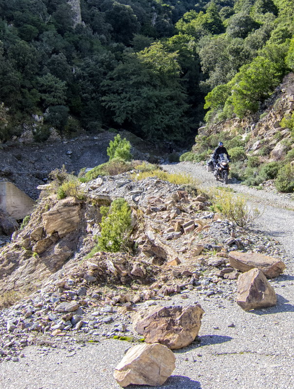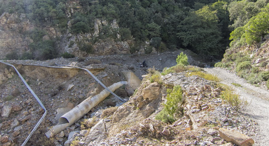 Offensichtlich sind Erdrutsche keine Seltenheit in abgelegen Bergregionen. Leitplanken, Entwässerungsrohre, Straßen, usw. werden in den Abgrund gerissen. Es bleibt dann eine Mischung aus Geröll und sehr losem Untergrund. Im Zweifel lieber erst gucken und dann weiter fahren.